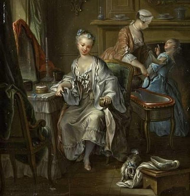 rmn-grand palais/Thierry ollivier Esta escena aparentemente anodina es en realidad bastante atrevida. Un orinal adecuado para la anatomía de las damas aparece en primer plano del cuadro. El perro se acerca a olfatear. Una sirviente está llenando un bidé. Es la década de 1740: el bidé es una pieza de mobiliario nueva. La dama va a proceder a su higiene personal. La sirvienta trata de ayudarla, pero desvía su atención hacia una niña.