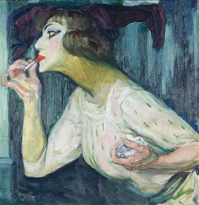 centro pompidou. mnam-cci. dist. rmn-grand palais/jean-claude planchet-adagp, parís, 2015 A comienzos del siglo XX, el desnudo femenino constituye para los artistas de vanguardia un desafío. Cézanne elige pintar bañistas en plena naturaleza. En este caso es Kupka quien retrata en este cuadro a una joven pintándose los labios con carmín rojo. Los colores están inspirados en el fauvismo: el verde del cuerpo, el blanco del rostro, el rojo de los labios... Esa combinación de colores es la que interesa a este artista.