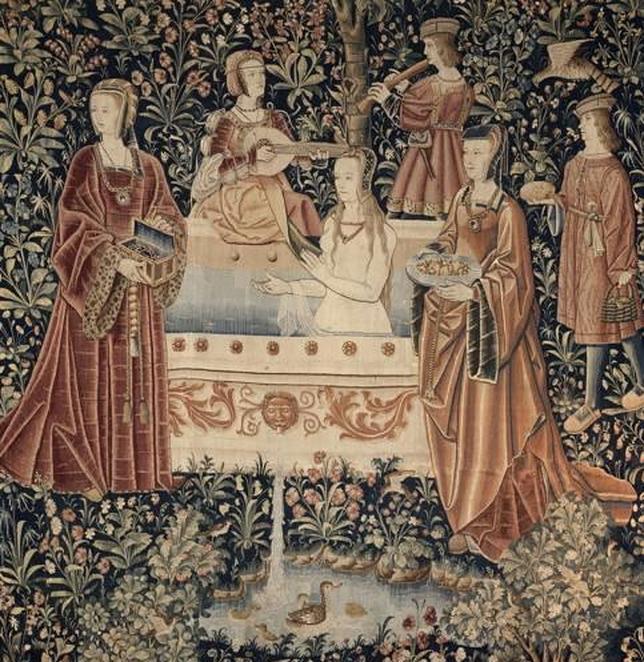 rmn-grand palais. museo de cluny-museo nacional de la edad media/franck raux Este tapiz de la colección del Museo de Cluny ilustra una escena en la que una joven noble toma un baño en verano en el jardín. Prepara su cuerpo, quizás para la noche nupcial. Unos tocan música en su presencia, otros le ofrecen joyas y alimentos. No se está aseando, considerado un acto demasiado prosaico en la época para ser inmortalizado en un tapiz. Permanece inmóvil, desnuda hasta la cintura, irreal, idealizada en su perfección. La excusa del baño le permite al artista realizar un canto a la belleza, a la feminidad. En la escena están presentes todos los sentidos: la música, los aromas, los colores... El baño, entendido como fuente de placer, y la oportunidad para el artista de representar el desnudo en medio de una decoración sublime.