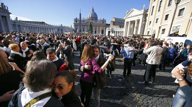 Un cumpleaños feliz» entonado a coro por los miles de fieles que esta semana abarrotaban la plaza de San Pedro, un tango y una milonga bailados por decenas de parejas y una tarta fueron los regalos que ayer recibió el Papa Francisco en su 78 cumpleaños, celebrado espontáneamente en una fría mañana de audiencia general. A pesar de que el Vaticano celebra solo el onomástico de los pontífices, durante el recorrido en papamovil, Francisco descendió para soplar las velas de una tarta con escrito en español: «Feliz Cumpleaños» y los colores de la bandera argentina (blanco y celeste) que le acercaron un nutrido grupo de seminaristas argentinos de los Legionarios de Cristo. Como el año pasado, cuando invitó por su cumpleaños a almorzar a cuatro sin techo, el Santo Padre también quiso estar ayer junto a los más necesitados y en el altar instalado en San Pedro saludó y abrazo a un grupo de ocho vagabundos que estaban acompañados por el limosnero pontificio, el polaco Konrad Krajewski, que le regalaron algunos girasoles.