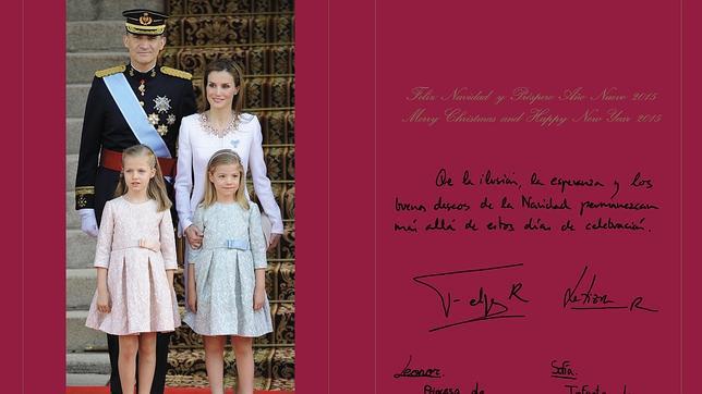 Los Reyes han elegido dos imágenes del día de la proclamación de Felipe VI para felicitar la primera Navidad de su reinado. En una de ellas se ve a Don Felipe y Doña Letizia de espaldas en el balcón del Palacio Real, ante la multitud que los aclamaba desde la plaza de Oriente. Con esa foto han querido transmitir un mensaje de cercanía a los españoles. En la segunda fotografía, tomada ese mismo día en la escalera de la Puerta de los Leones del Congreso de los Diputados, los Reyes aparecen con sus hijas, la Princesa de Asturias y la Infanta Sofía. En la felicitación, Don Felipe y Doña Letizia expresan su deseo de «que la ilusión, la esperanza y los buenos deseos de la Navidad permanezcan más allá de estos días de celebración». Como novedades, el cartón de la felicitación es de color carmesí (como el guión del nuevo Rey) en lugar de blanco, incluye dos fotografías y Don Felipe y Doña Letizia añaden a sus firmas la letra R de Reyes. Además, Leonor firma por primera vez como Princesa de Asturias, y Sofía como Infanta de España.