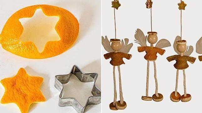 ecologismos.com Aprovecha que la naranja es una fruta de temporada en otoño y sácale el máximo partido. Utiliza las pieles para hacer bonitos adornos para el árbol, que además desprenderán un agradable aroma. Procura desprender la piel con un pelador o cuchillo de manera que la monda quede lo más grande posible. Con un molde para galletas o un cúter, recorta la forma deseada (estrella, muñeco de jengibre...) y cuelga estos motivos del árbol de Navidad. Puedes crear también guirnaldas y colocarlas, por ejemplo, en la cocina en estas fechas.