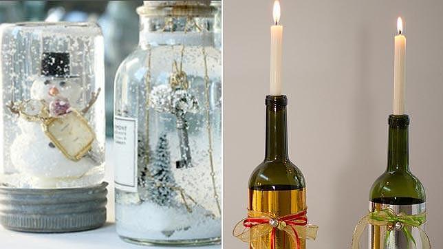 www.ecologiablog.com/www.guiademanualidades.com Asegúrate de que los botes son de un cristal o vidrio resistente y de que soporten altas temperaturas. Para hacer bolas de cristal con nieve, limpia el bote y pega las figuras que desees en la tapa; llena el recipiente con purpurina plateada, ciérralo y séllalo bien. Cuando lo agites obtendrás un bonito resultado. También puedes usar botellas con formas originales como portavelas para usar como centro de mesa cuando tengas invitados.