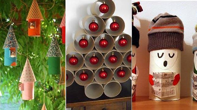 trucosyastucias.com/19bis.com/www.labioguia.com Una de las manualidades más sencillas, baratas y bonitas es hacer el árbol de Navidad con el cartón de los rollos de papel higiénico. Solo necesitas 17 cilindros, pegamento y quince bolas rojas. Usa dos rollos para la base y ve pegando los demás en forma de abeto. En cado uno de ellos habremos colgado una bola con la ayuda de un poco de cinta adhesiva transparente o una grapa. Si prefieres usar los rollos para hacer adornos solo tendrás que pintarlos de colores y ponerles un calcetín pequeño a modo de gorro, de esta manera obtendrás a los personajes del coro o pequeños Santa Claus. Si a los rollos les pegas conos de cartulina como techo y les abres una ventana con un cúter tendrás casitas para pájaros para adornar tu árbol.
