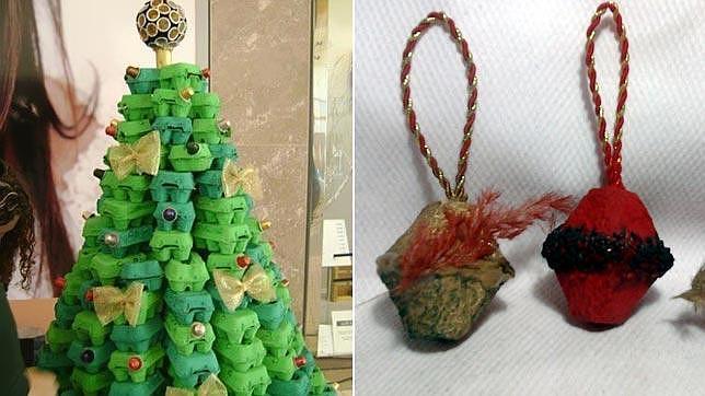 www.decoesfera.com/elrincondevalpal.blogspot.com Usa cartones de huevo vacíos de una docena o media. Píntalos de diferentes tonos de verde y pégalos apilados en forma de abeto. También puedes separar los compartimentos y unirlos de dos en dos para formar los adornos del árbol como muestra la imagen de la derecha.