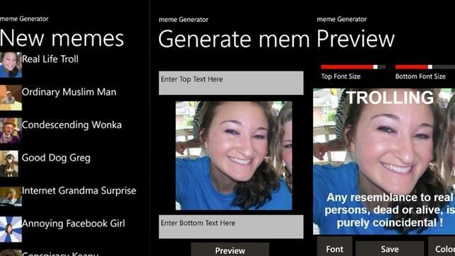 Para la plataforma de Microsoft, Windows Phone, se pueden encontrar otras tantas para este mismo objetivo. Una de ellas es « Meme Generator», que incluye más de 100 «memes» populares y nuevos. El usuario puede tomar una imagen de su propio álbum, hacerla directamente desde la cámara, cambiar el texto entre cuatro fuentes disponible y en cinco colores, así como su tamaño. « Meme Lens PRO» tiene las mismas características que la anterior, aunque da la opción de introducir el típico emoticono que tapa la cara de las personas.