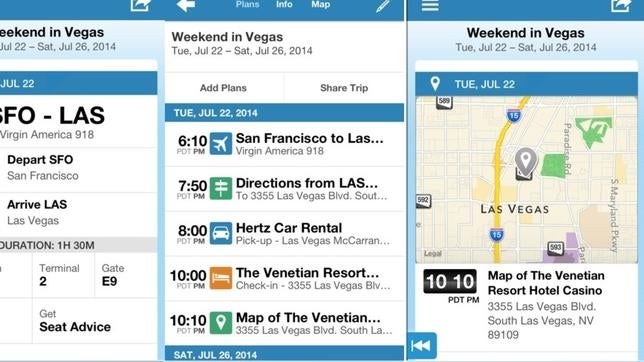Se presenta con el lema «organiza tus planes de viaje en un solo lugar». Y así es. Porque esta app», disponible para iOS, Android, envía todos los emails de confirmación de hoteles, líneas aéreas, rent-a-car y restaurantes de manera automática. Además, el servicio cuenta con un sistema cartográfico desde donde obtener direcciones y conocer los tiempos de viaje.