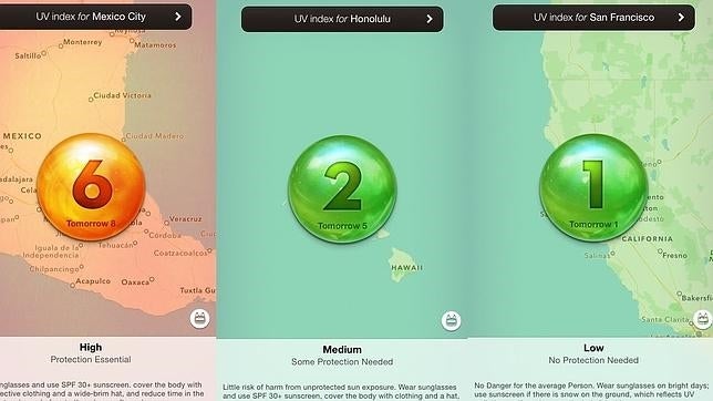Esta aplicación, disponible para iOS, muestra el índice de rayos ultravioleta ten tiempo real desde cualquier ubicación del planeta. Datos importantes a conocer, puesto que la exposición excesiva a la radiación ultravioleta puede tener efectos graves en su salud, no solo de quemaduras, sino también lesiones oculares, envejecimiento de la piel.
