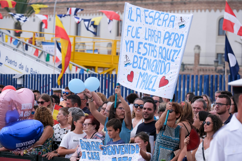 El de Raúl y María no era el caso habitual. Lo normal es que las parejas de los marinos y marinas estuviesen a pie de muelle para esperar su llegada. Luisa Aguilar era una de ellas, que llevaba una pancarta para darle la bienvenida a su pareja, Manuel. Ellos son jandeños (ella de Paterna y él de Medina) y, como le resto de los tripulantes, llevan seis meses sin verse. «De vez en cuando puedes hablar, pero el problema es cuando están en alta mar, que no hay conexión». Luisa bromea con que fue a visitar a Manuel cuando el barco llegó a Cuba «así que si se va de viaje de nuevo, me voy con él».