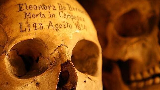 RomaSotterranea En la Via Giulia, que corre paralela al Tíber, justo a la altura del Palazzo Farnesse, se encuentra la Iglesia de Santa María de la oración y la muerte, un extraño templo que tiene una cámara secreta con candelabros realizados con huesos y innúmeras calaveras. Algunas, como la de la foto, tienen el nombre del finado (finada en este caso) y la fecha de su muerte. Pero seguimos hacia abajo....