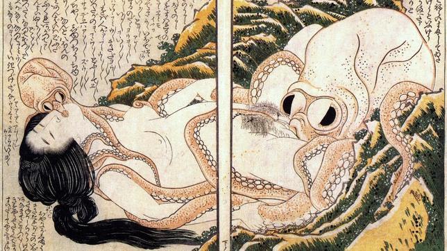Japón, sus leyendas y sus representaciones han dado las mejores estampas eróticas (shunga). Y Hokusai es el más importante. En esta serie de imágenes recrea la leyenda de Taishokan (Periodo Edo), donde una mujer se sumerge en el fondo del mar para recuperar una joya robada a su hijo y es perseguida por monstruos acuáticos y dragones marinos... La imaginación explícita de Hokusai hizo el resto.