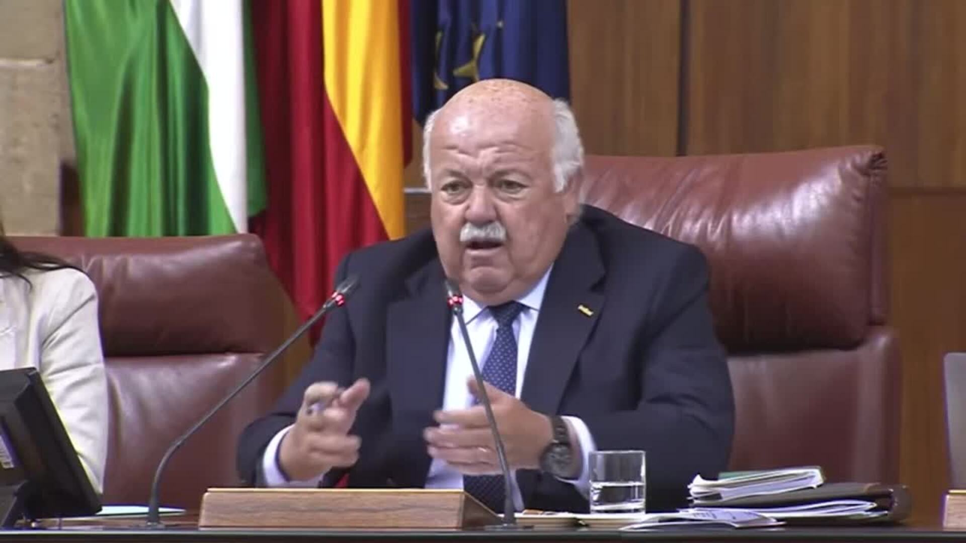 El presidente del Parlamento de Andalucía, Jesús Aguirre (PP-A), ha abroncado este miércoles a la presidenta del Grupo Mixto-Adelante Andalucía, Maribel Mora, después de que ella haya arrojado arena sobre el escaño del presidente de la Junta, Juanma Moreno, en el salón de plenos durante el debate de la toma en consideración de la proposición de ley de PP-A y Vox relativa a la regulación de regadíos en municipios del Condado de Huelva, en el entorno del Parque Nacional de Doñana.(Fuente: Parlamento Andalucía)