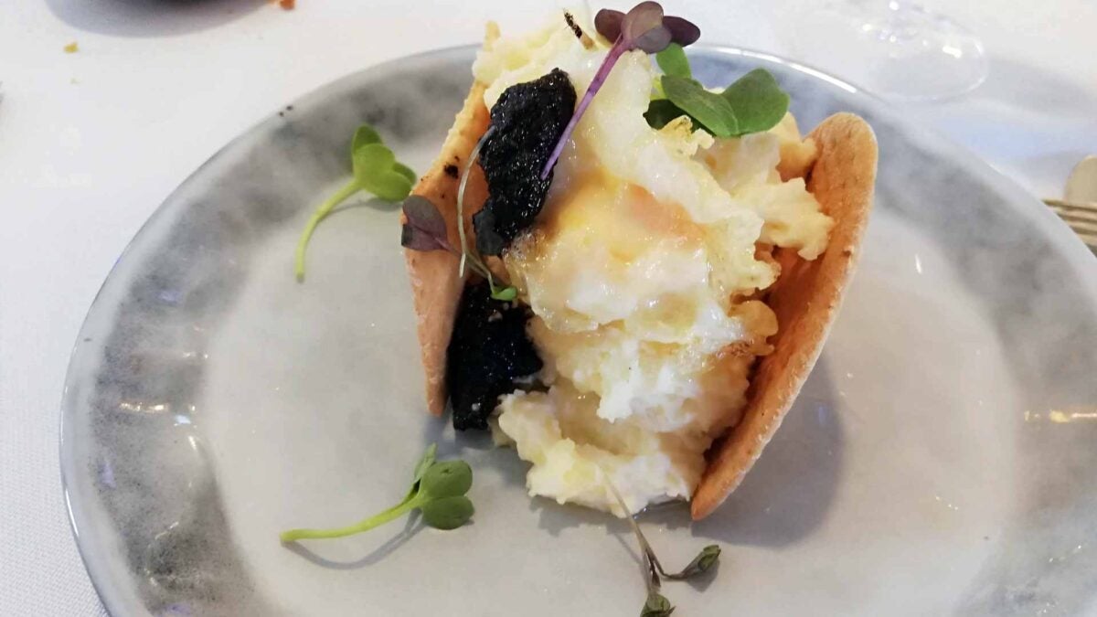 Ensaladilla de blancas, bogavante azul, huevo frito y trufa.