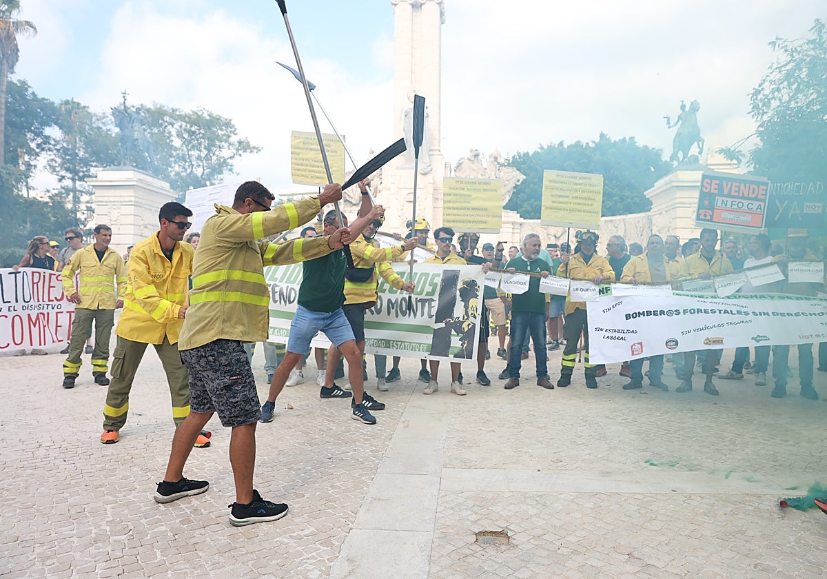 Los bomberos forestales de la provincia de Cádiz se han concentrado este miércoles frente a la sede de la Junta de Andalucía, en la plaza de España, para denunciar la precariedad laboral que sufre el colectivo. La protesta, convocada por CCOO, UGT, CGT y el Sindicato Independiente de Bomberos Forestales del Infoca han reunido a decenas de profesionales bajo el lema «Infoca no se vende, se lucha y se defiende».