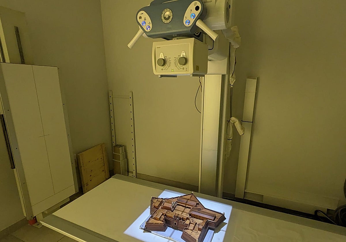 Las radiografías, una herramienta habitual en el diagnóstico clínico pero extraordinariamente útil también en el análisis del patrimonio, permiten detectar fisuras, uniones, materiales y transformaciones invisibles a simple vista. En el caso del Hospicio (hoy edificio de Valcárcel) el estudio reveló incluso la presencia de clavos, un sistema de sujeción singular dentro del conjunto de la Maqueta, que lo convierte en una pieza excepcional.