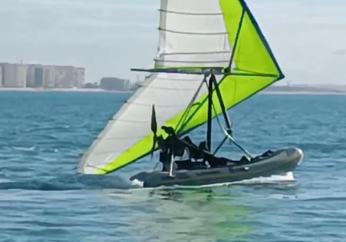Cae al agua cuando intentaba cruzar la Bahía de Cádiz con una zódiac voladora: una hinchable con un motor y un ala-delta