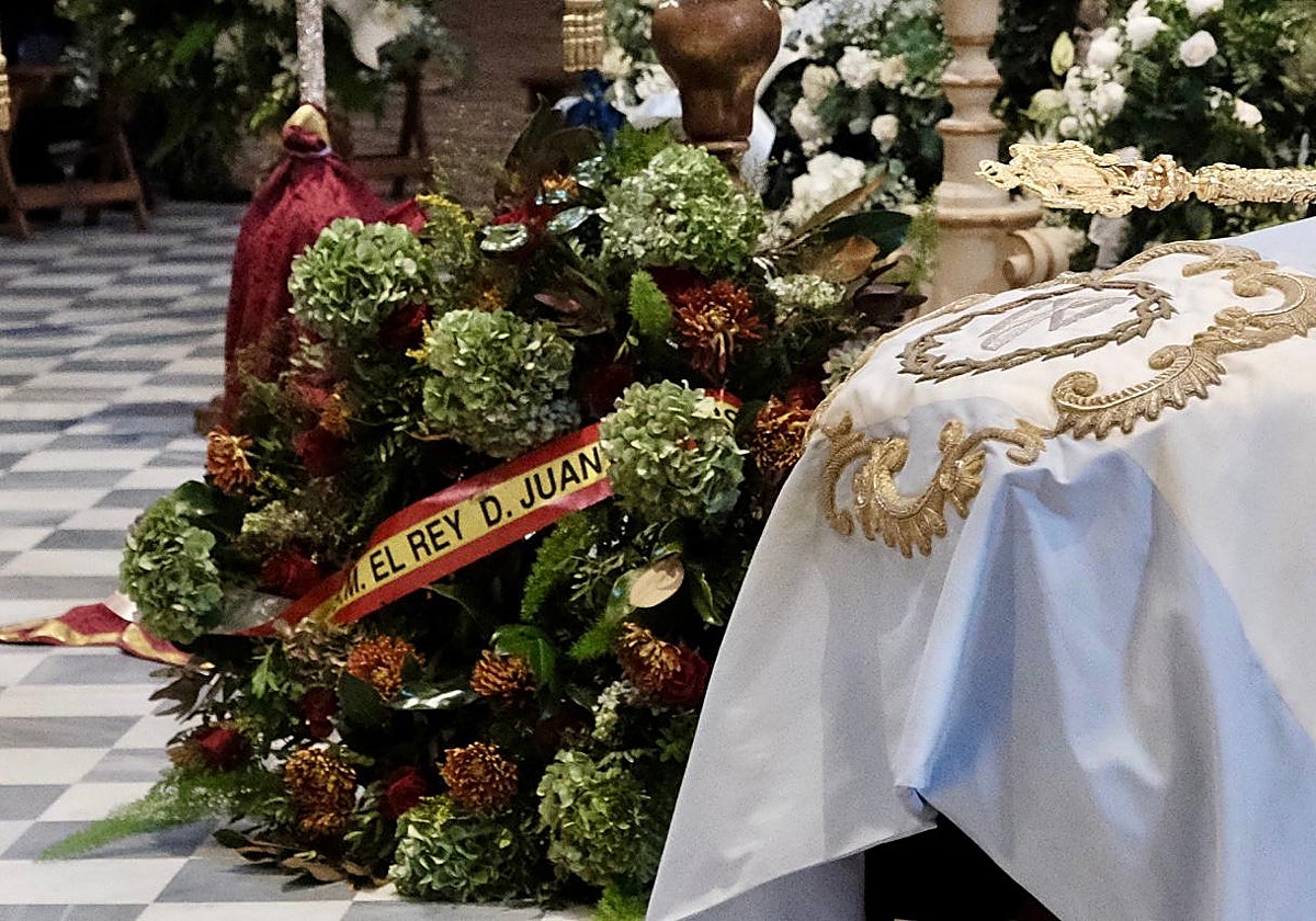 Sobre el ataúd descansa un paño blanco bordado con el emblema de la hermandad Amor y sacrifico, de la que Domecq Romero era miembro; la hermandad del Rocío de Jerez también está presente en el paño mortuorio negro.