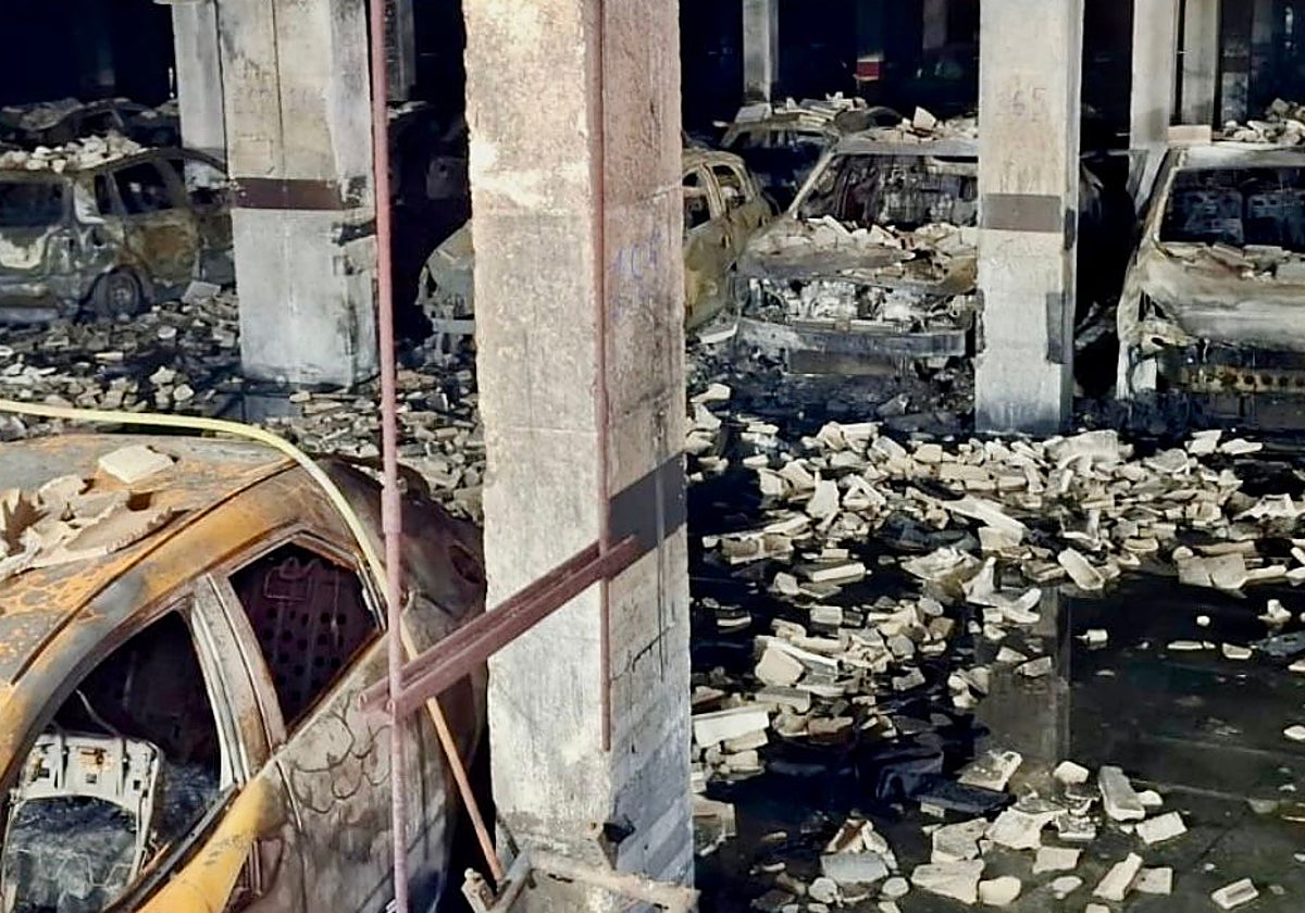 Las imágenes de cómo ha quedado el garaje tras el incendio son impresionantes con vehículos calcinados y el suelo lleno de escombros. De hecho, cuatro efectivos bomberos siguen trabajando en el desescombro del garaje