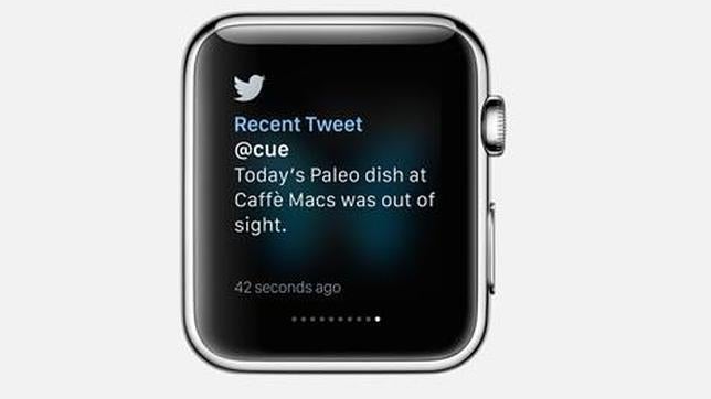 No podía faltar la popular red de «microblog» Twitter, con casi 300 millones de usuarios en todo el mundo. La versión para el reloj de Apple permitirá consultar las notificaciones recibidas, tales como los nuevos «tuits», si el usuario recibe un «retuit» o destacan como favorito alguno de sus mensajes. También permitirá ver la lista de los «trending topics» y componer entradas de hasta 140 caracteres mediante los comandos de voz.